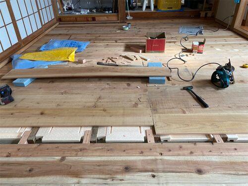 勢いで始めてしまった床下の工事というんでしょうか、大きな工作。はっ!だから大工というのか!? 夜。フクロウが鳴いています。 もう数日前のことですが床作業3日目の記録。 昨日は板を並べるとこまででした。今日は昨日の続き、板並べて柱のとこはカット…