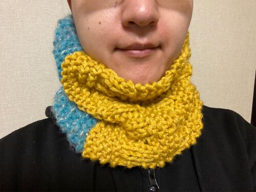 ざっくり20センチ幅くらいで手持ちのネックウォーマーと同じくらいのサイズになるように。玉巻きのやり方を覚えたので とりあえず編んでみて気に入らなかったら解けばいいやと思って大体のイメージで編みはじめる。毛糸はすべて100円ショップの。 まず極太グ…